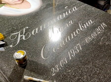 Переходим к созданию надписи. Вырубаем её на граните, затем покрывает акриловой краской. Такой вариант является отличной альтернативой покрытию сусальным золотом, который, к тому же, обходится клиенту значительно дешевле.