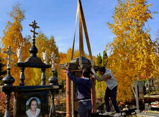 Начинается процесс монтажа. Доставляем памятники, крепим их, приклеиваем и насаживаем на штыри все конструктивные элементы надгробий.
