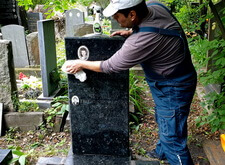 Сметаем с бортов цветника лишнюю землю, после чего переходим к самим надгробьям: вытираем памятники, немного проявляя надписи на их поверхности. Параллельно с этим протираем цветники, окончательно удаляя рассыпанную в процессе посадки землю.